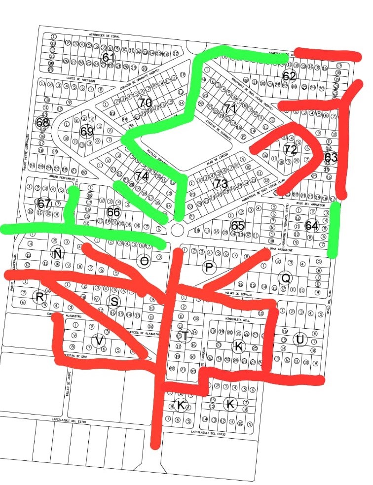 - Se colocó nuevo material base en calles que se vieron comprometidas en la última tormenta. Debido al alto caudal de agua que circuló por el Barrio, dejó sin la compactación necesaria para garantizar el tránsito. (Líneas Roja)